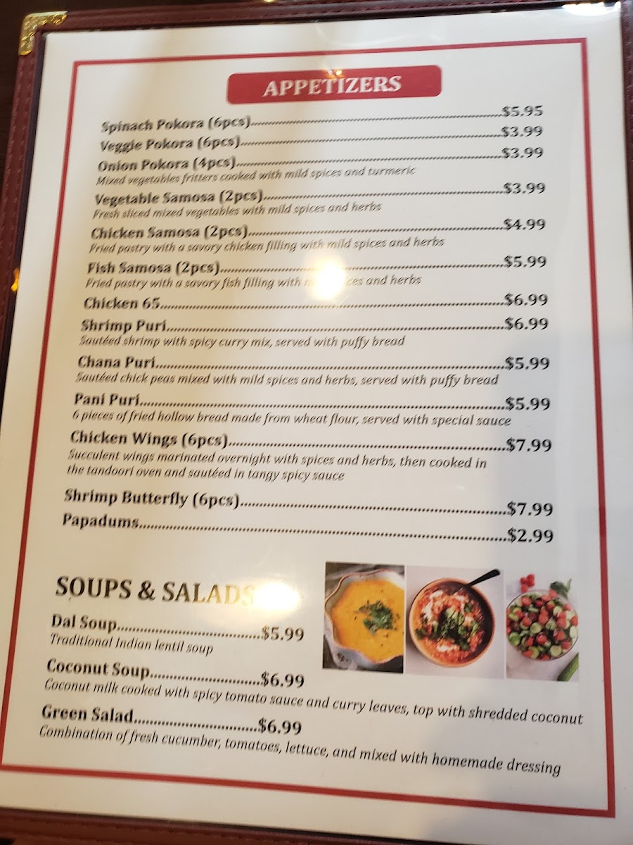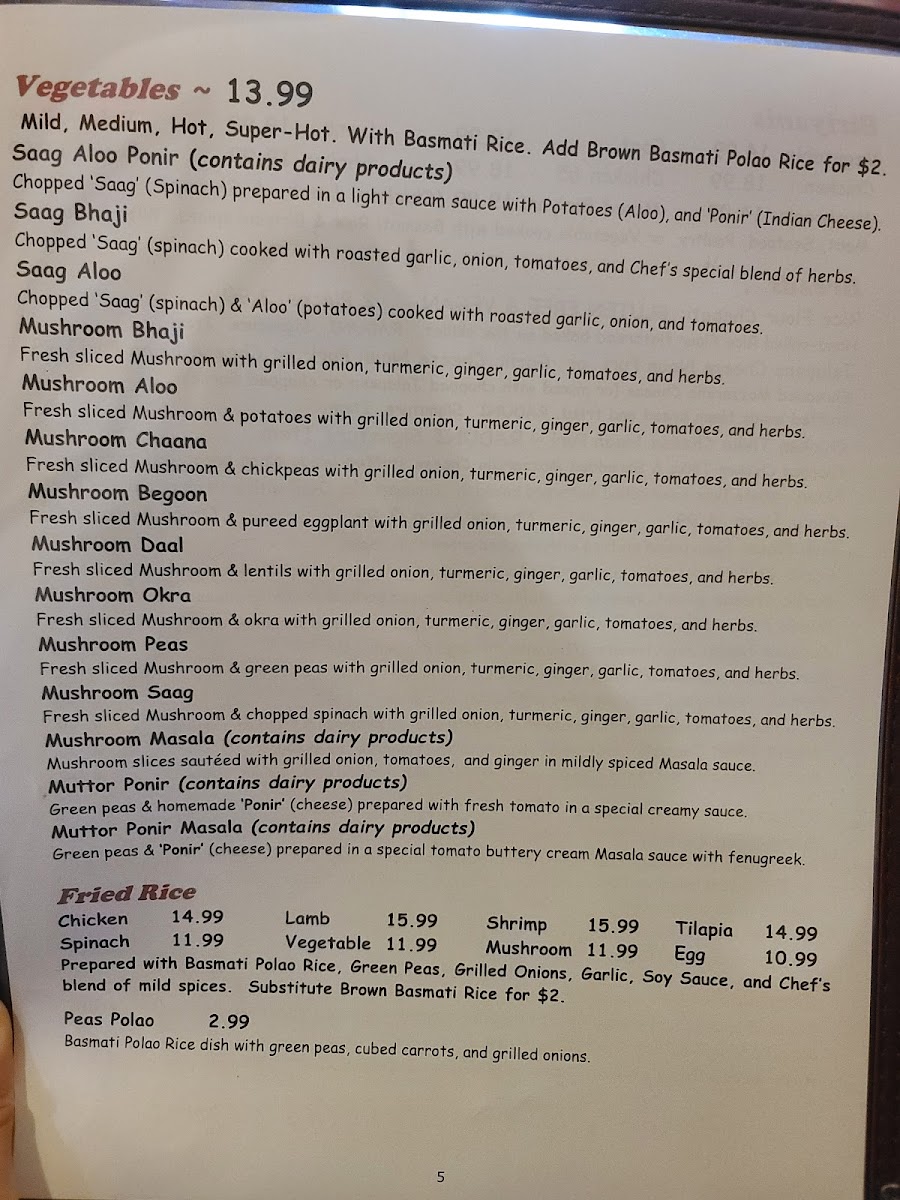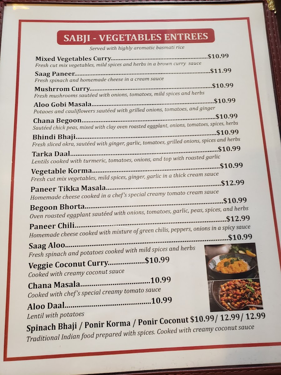 Some highlights you might find include Garlic Naan served alongside hearty Chicken Biryani or a creamy Paneer Tikka Masala. For those interested in something light and flavorful, starters like Tilapia Samosas or Paani Puri offer a tasty introduction to the meal. The menu also features a range of lentil dishes and chicken preparations, such as Chicken Vindaloo and Chicken Korma, catering to both mild and spicier preferences.